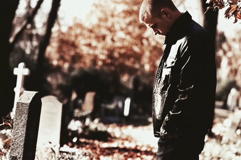 Мъж гледа надгробен камък на гробище | Източник: Midjourney